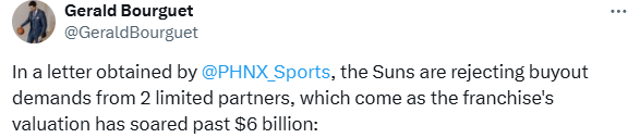 北京时间8月27日,据太阳记者Gerald Bourguet报道,太阳估值已经超过60亿美元且整体估值逼近70亿美元,球队管理层基于当前估值飙升的情况,拒绝两位小股东8.25亿美元的套现要求。